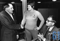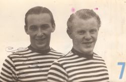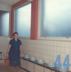 | 45 | gogl – Skansevejens Skoles svømmehal. Fru Mikkelsen der holdt ud til det sidste. 22 år som bademester Sonnes assistent. Bademesteren er selv til venstre. |